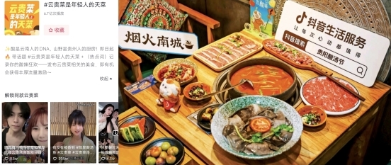 以云贵菜的爆火为例,追溯到2023年,那时以贵州酸汤为代表的云贵美食在抖音走红,后来云贵菜的话题热度、订单量就开始在抖音高速增长。
