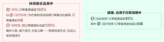 过去一年中,武汉的洗浴按摩订单量增长9成,杭州的洗浴按摩订单量增速超85%,其中足疗按摩订单量增速也超8成。
