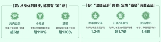 在冬季,济南的牛羊肉火锅、汗蒸温泉订单量分别是夏季的1.2、1.7倍;而夏季,济南的烤肉自助、小龙虾等具有“爽感”的品类增长迅猛,订单量同比分别增长超6倍、超110%。